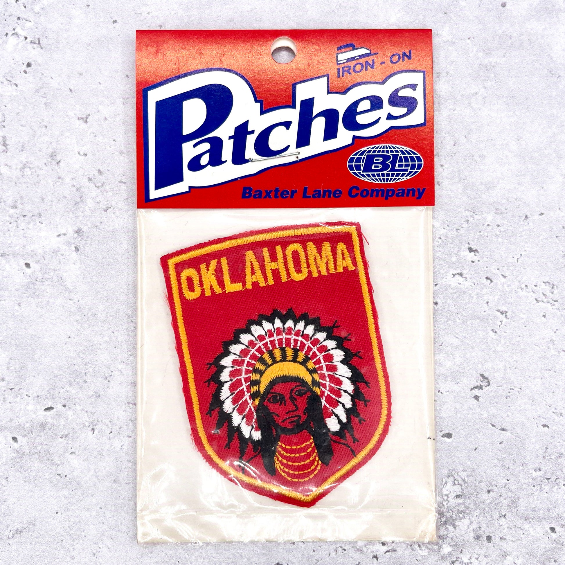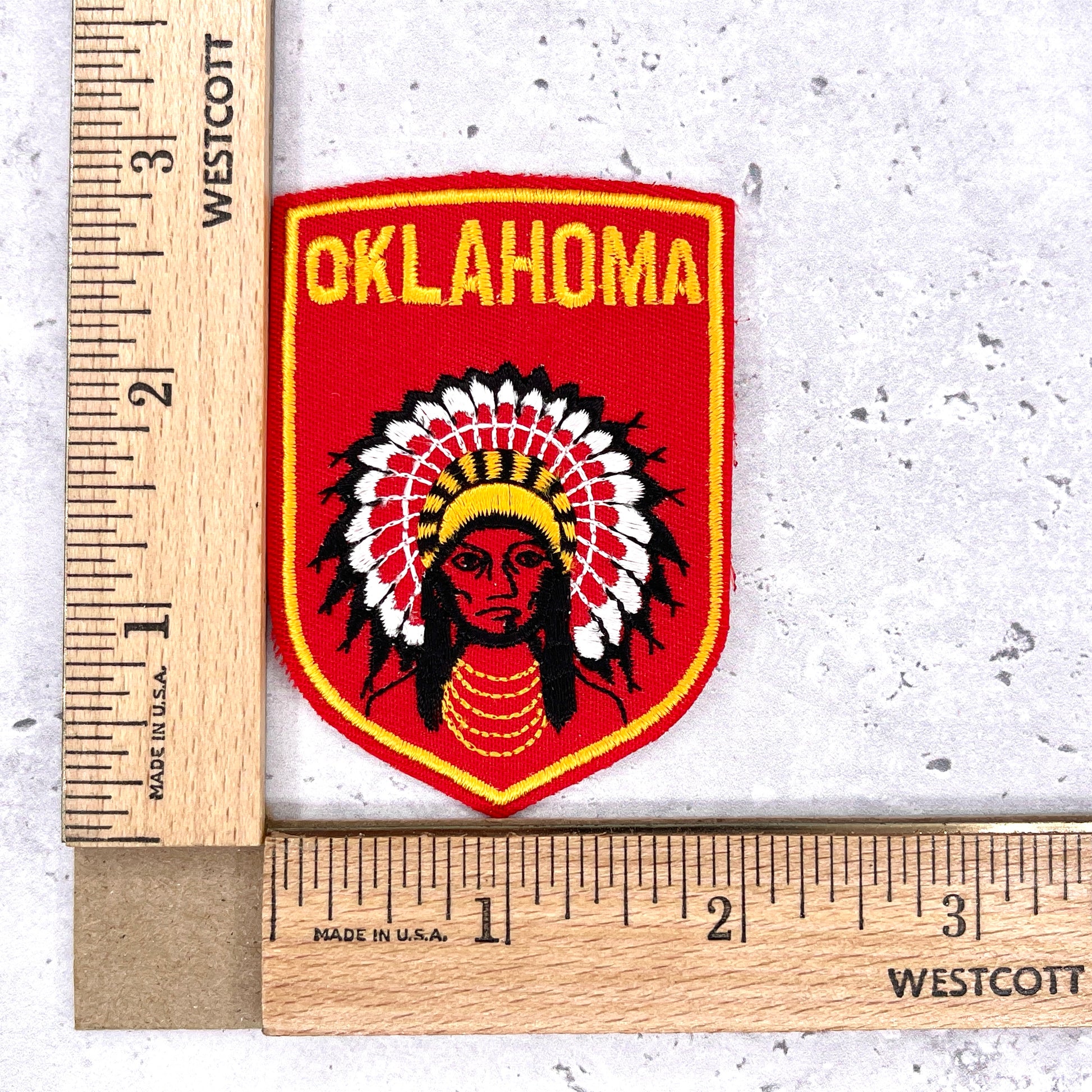 Vintage Oklahoma state patch, manufactured in the 1980s. Has an iron-on backing, but may need to be sewn-on due to its age. New old stock, includes original packaging